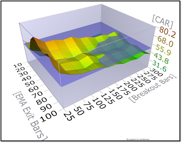 However the drawdown profile for the shorter period breakouts is much worse because of the large number of false breakouts. It is not until you get to about a 75-100 day breakout that the drawdown really becomes manageable.