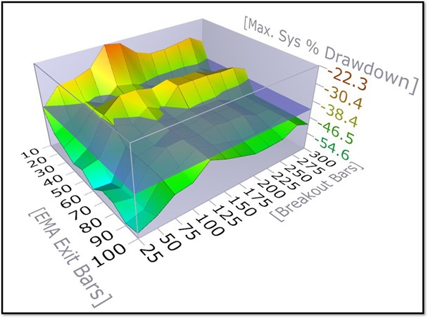 The charts below show the return and drawdown profile over a wide range of parameter values for both breakout periods and exit EMA lengths. As you can see, the return for the shorter breakout periods is much higher – obvious really, because Bitcoin has moved up massively over time and the trends are pretty explosive, so the earlier you enter the better from a return perspective.