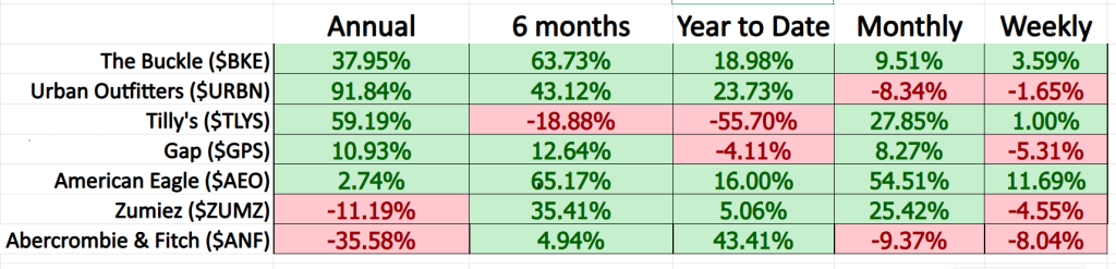 Let’s talk competitors. Buckle’s main rivals are the usual suspects of teenage mall culture: American Eagle (AEO), Abercrombie & Fitch (ANF), Urban Outfitters (URBN), Zumiez (ZUMZ), Tillys (TLYS), and good old Gap (GPS). Each of them has their own problems — Abercrombie has been busy with a brand makeover, Urban Outfitters sells to kids who’d rather thrift, and Gap has been trying to re-learn how to make jeans since the Obama administration.