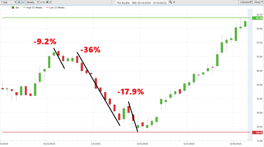 If you ever wanted proof that stocks behave like a caffeinated teenager with car keys, look no further than Buckle’s 52-week chart. A year ago, this thing was sulking around $33.12, the market equivalent of skipping class. Fast forward and it’s now strutting up at $61.69, brushing right up against the 52-week high like the kid who suddenly shows up to prom in a rented tux and a questionable haircut. Traders love this picture not because it’s pretty, but because it tells you everything about the mood swings baked into a stock.The first question a savvy trader asks when staring at this chart is: how fast did it make the leap from loser to leader? Was it a slow grind — months of slogging higher? Or was it a sprint —panic buying, short covering, and a wave of “I’ll miss it if I don’t buy now”? The speed of that move says a lot about whether there’s conviction behind the rally, or if it’s just another market sugar high.