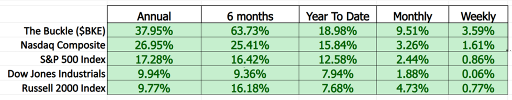 Here is a table which shows the performance of the Buckle to its main competitors across multiple time frames: