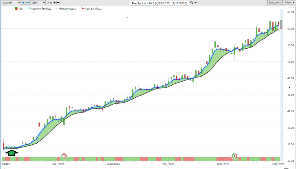 Now, take a look at the attached chart of The Buckle (BKE). At the base, you see the Neural Index. When it’s green, price has pushed solidly higher — note the strong uptrend that followed those signals. But when the index turns red, that’s the system warning of near-term weakness. In practice, that means traders should expect price to pull back, often slipping below the predictive blue line until conditions reset.