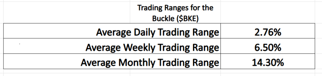 Folks, let’s talk about opportunity wrapped in volatility. Take a look at these trading range metrics for Buckle: the average daily range sits at 2.76%, the weekly expands to 6.5%, and the monthly balloons to more than 14%. That’s real movement. For traders, it means there’s plenty of meat on the bone. These aren’t the slow-grinding names that sit flat and sap your capital; this is a stock that gives you room to maneuver, room to trade, and room to win.