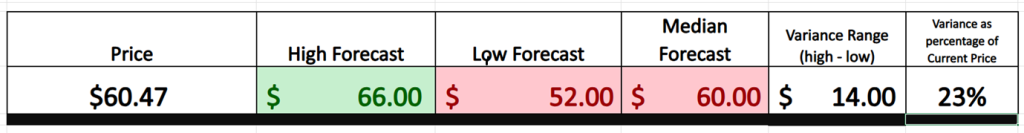 Over the last three months, 13 Wall Street analysts have issued 12-month price targets for Cameco. The average comes in at $60, with the most bullish at $66 and the most bearish at $52. That’s a variance of 23% and here’s the key point: that variance is your real-time read on expected volatility. Not what the VIX says. Not what options pricing implies. This is the market’s collective forward-looking view of how unpredictable — or predictable — Cameco’s path may be over the coming year.