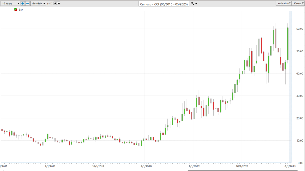 The 10-year chart of Cameco tells a story of reinvention. For years, nuclear energy sat in the shadows, haunted by political risk and public skepticism. But the macro backdrop has changed. Carbon targets, energy security, and geopolitical pressure have reshuffled the deck — and Cameco has emerged not just as a survivor, but as a frontrunner.