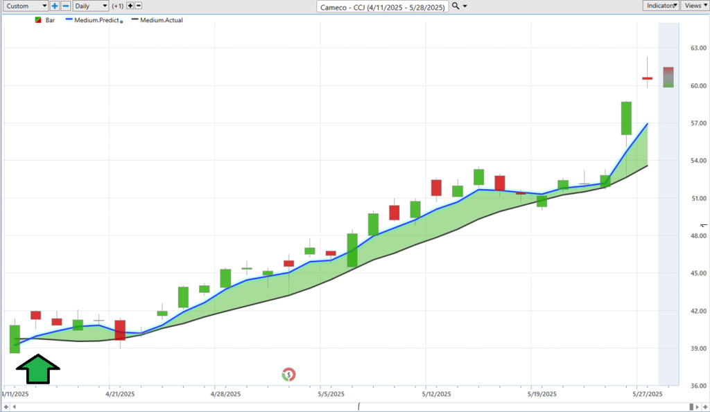 When that Predictive Blue Line starts pointing up, that’s your signal that $CCJ is gaining steam and institutional money may be stepping in. And when the line starts tipping downward? That’s not the time to daydream. That’s your early warning system firing off flares — suggesting you tighten those stops, take some profits, or reevaluate your position before the market hands you a lesson in humility.