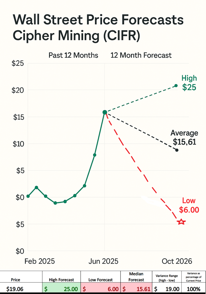 Take a look at this chart — it practically shouts “indecision.” Wall Street’s price forecasts for Cipher Mining (CIFR) couldn’t be more split if they tried. The most bullish analyst sees the stock racing toward $25, while the most bearish sees it collapsing to $6. That’s a $19 spread, or roughly 100% of the current price — meaning the Street is hedging every possible outcome, from moonshot to meltdown. In plain English: volatility isn’t coming, it’s already baked in.