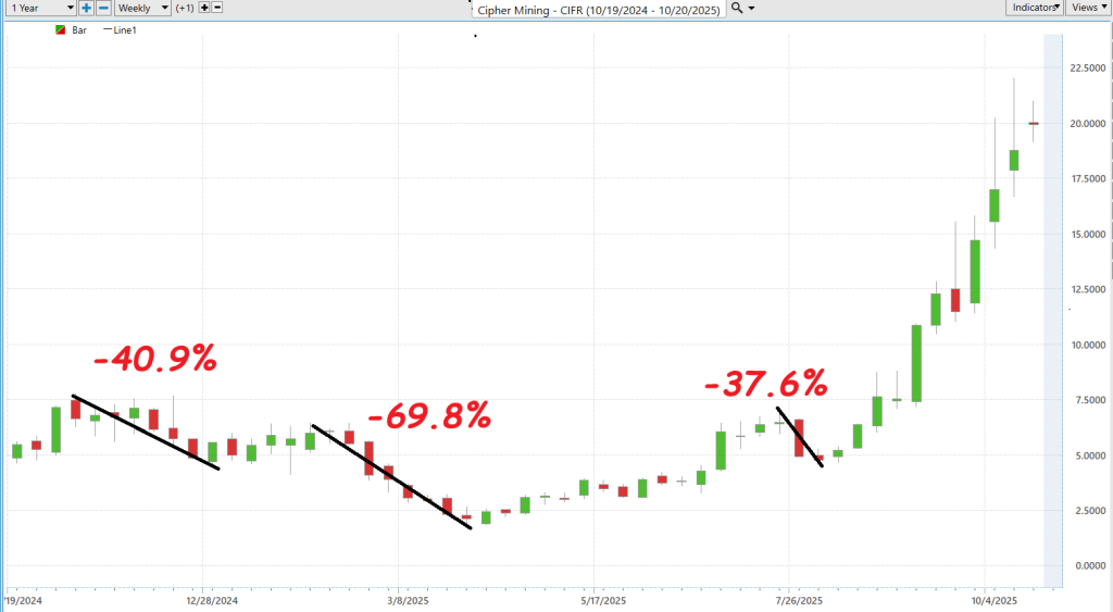 If you want to understand what kind of animal Cipher Mining ($CIFR) really is, these two charts tell the story better than any analyst note ever could. The first one, painted in red, is the reality check — a visual reminder that this stock can fall fast and hard. We’ve seen uninterrupted drops of –40.9%, –69.8%, and –37.6% over the past year. Those aren’t corrections; they’re freefalls. Each one wiped out weeks of gains in a handful of trading sessions. That’s what raw volatility looks like when it stops being a number and starts being a feeling. You can’t trade a chart like that without discipline; it will humble anyone who mistakes momentum for safety.