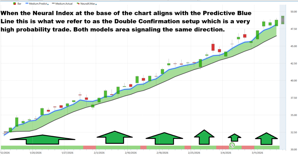 A neural network, in the context of trading, is essentially a system trained to recognize patterns across vast amounts of intermarket data and translate them into short term forecasts. It is not predicting the future with certainty, but it is identifying probability shifts, often before they are visible in price alone. In this case, the Neural Index is offering a forward-looking signal over the next 48 to 72 hours, acting as an early warning system for changes in momentum. When that signal turns red, what follows is not chaos but a fairly orderly response. Price tends to soften, pulling back toward and often below the predictive blue line, creating moments where the trend resets and more favorable entry points emerge.
