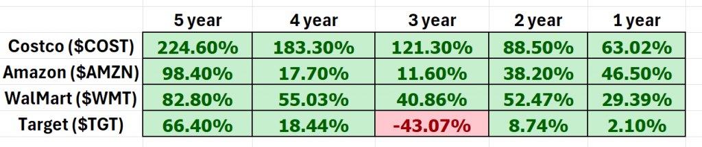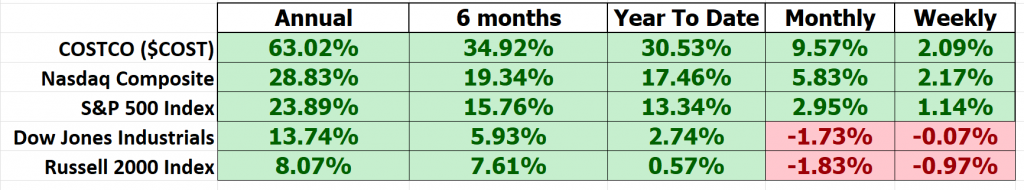Costco continues to outperform all of the major stock market indexes across all time frames.