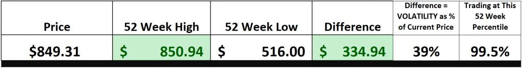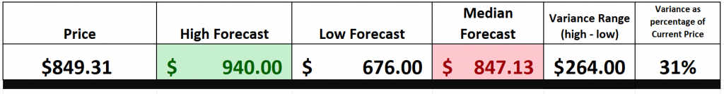We pay attention to the variance between the most bullish and most bearish forecast to provide us with a better understanding of expected volatility. Currently this variance is $264.00 or 31% of the current price.