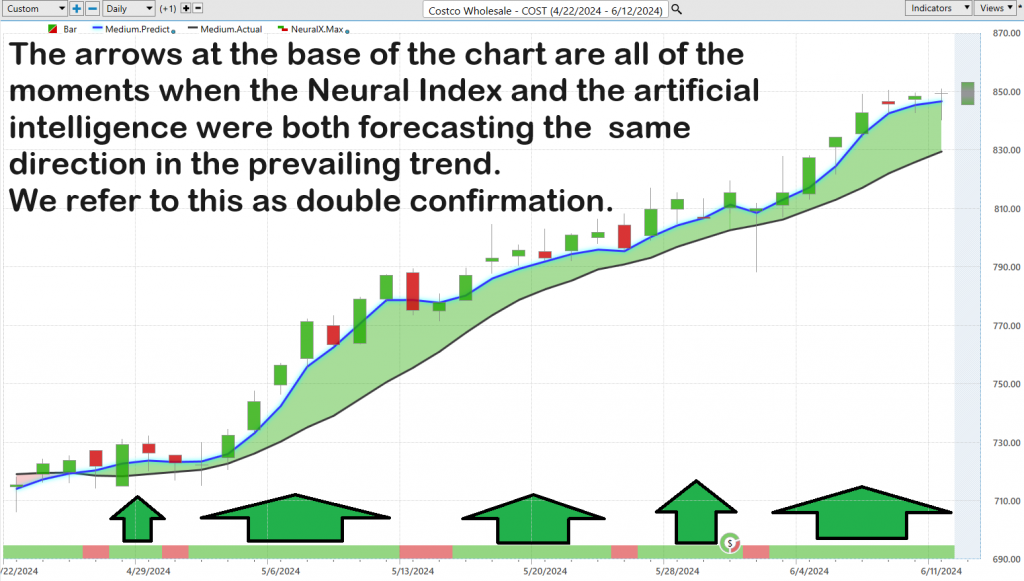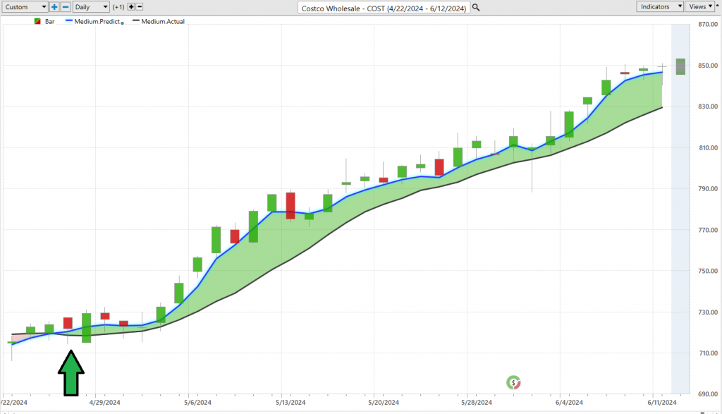 Let’s crank up the heat on how traders are using cutting-edge tech to chart their course in the markets, specifically focusing on the Vantagepoint Predictive blue line. This tool isn’t just another line on a chart; it’s a powerhouse for traders, leveraging the magic of artificial intelligence and machine learning, combined with a sophisticated intermarket analysis to predict market trends. The blue line acts like a compass in the wilderness of stock trading, pointing out the medium-term price trends for stocks like Costco.