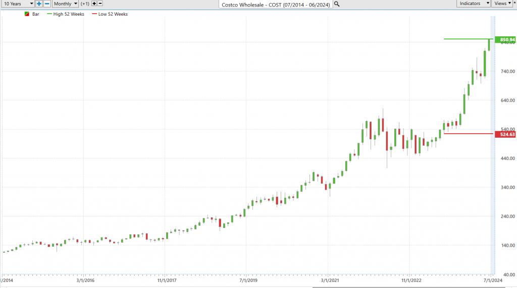 Let’s zoom out for a moment, pull up a long-term chart, and take a real good look at the journey this giant has been on. If you survey the span of the last decade, you’ll see that $COST has been hitting new 52-week highs year after year. That’s not just growth; that’s a testament to sustained, superior performance. More importantly for 6 of the last 12 months it has been making new 52-week highs and new 10-year highs simultaneously.