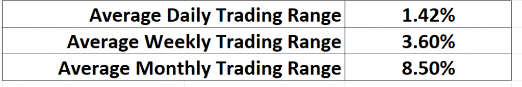 Here are the average daily, weekly, and monthly ranges for Costco over the past year.