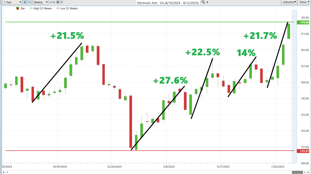 The past year’s performance shows $EA outpacing every major index over multiple time frames, with especially dominant gains over the last six months (+37.04%) and one month (+19.54%), reinforcing the bullish control seen in the rally/decline charts. This strength highlights both the magnitude of opportunity for trend traders and the need to respect the sharp reversals that have historically followed such powerful advances.