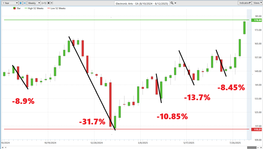 Over the past year, Electronic Arts has delivered some remarkable uninterrupted rallies — up 21.5%, 27.6%, 22.5%, 14%, and 21.7% — that underscore just how decisively the bulls have controlled the tape. But the same charts also reveal sharp declines of 8.9%, 31.7%, 10.85%, 13.7%, and 8.45%, a reminder that in markets, gravity works both ways. The opportunity here is clear: momentum traders have a history of capturing double-digit upside runs. Yet the potential downside is equally real, and those same sharp reversals warn that discipline and risk management are not optional. For now, the bulls hold the advantage, but the charts make it plain — ignore the downside at your peril.