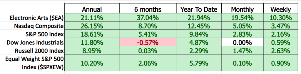 Next, we compare $EA to all of the stock market averages to see and compare performance and volatility across multiple times frames.