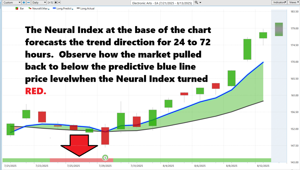 Look at the chart of Electronic Arts ($EA) and you’ll see what a proactive edge can look like. The VantagePoint A.I. Predictive Blue Line has a track record of tilting higher before price acceleration and flattening or rolling over ahead of pullbacks. This isn’t a lagging indicator — it’s a forward-looking signal designed to identify momentum shifts in their early stages. When the Blue Line starts to lift, it’s often the first subtle indication that institutional money is building positions; when it curves lower, it’s the advance notice to scale back, tighten stops, or step aside before a routine dip turns into a more meaningful drawdown.