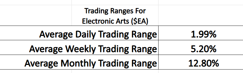 Here are the average trading ranges in $EA for the daily, weekly and monthly time frames over the past year.