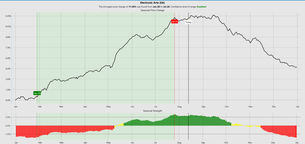 Seasonal analysis is one of those underappreciated tools that can separate the pros from the pack — it’s about recognizing that the market, like the weather, has seasons. You see certain stocks heat up at the same time every year, and if you know when that window opens, you can ride the wave instead of chasing it. For $EA, history says it starts climbing in mid-January, powers higher into late July, and often keeps that momentum rolling into mid-October. That’s exactly what we’re seeing here, and if history rhymes again, this could be one of those stretches where the stock rewards traders who get in early and stay disciplined until the seasonal tailwind fades.