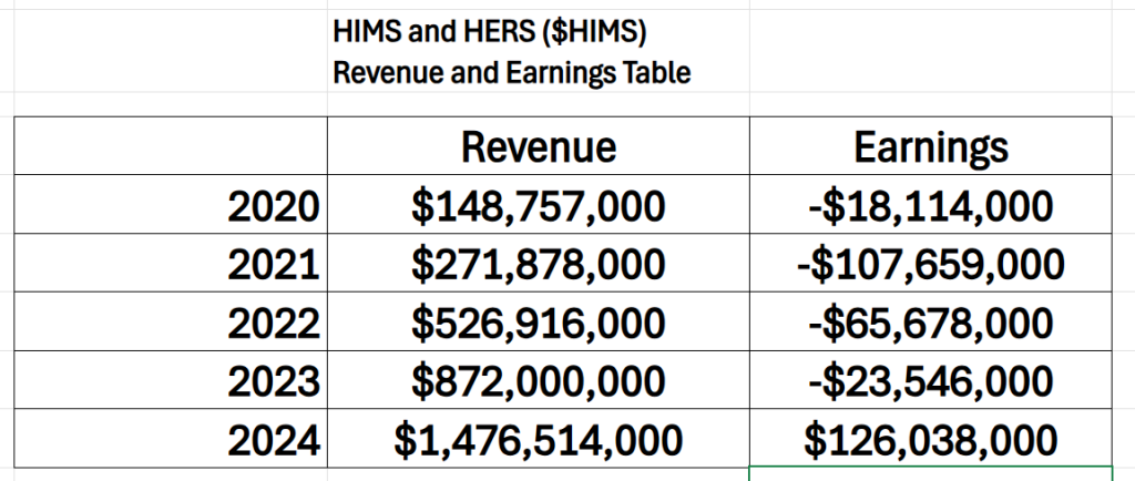 Here are the revenue and earnings over the last 5 years. On the surface what has Wall Street very excited is that it looks like $HIMS has turned the corner to profitability. Revenue has grown by 893% over the past years, and in 2024 the company stopped losing money since becoming public.