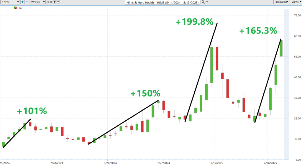 Take $HIMS, for example. Run the data — daily, weekly, monthly ranges across the past year — and the story jumps off the screen. You’ve got consistent, tradable volatility. The kind of price action that doesn’t just twitch for no reason, but pulses with opportunity if you know how to ride it.