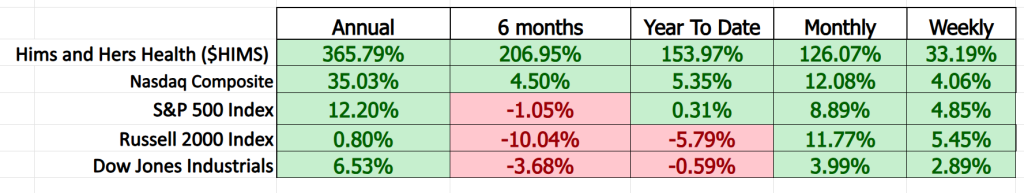 We can quickly see that $HIMS has outperformed all of the major stock indexes across all time frames.