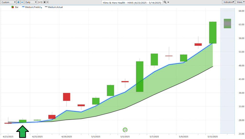But here’s where the seasoned traders set themselves apart: they understand the Value Zone. This is that pivotal moment when $HIMS touches or dips just below the Predictive Blue Line during an uptrend. Amateurs panic. Professionals lean in. Because more often than not, this brief retreat is simply the market pausing — offering a second-chance entry before the next leg higher.