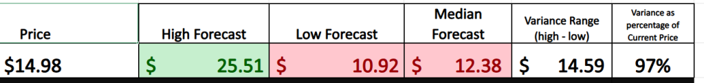 We always advise that traders pay very close attention to the variance between the most bullish and most bearish forecasts. This variance and metric provide us with a solid idea of what Wall Street’s expectations are for the stock moving forward. Currently this level is $14.59 or 97% of the current price. This is a very high level of future volatility.
