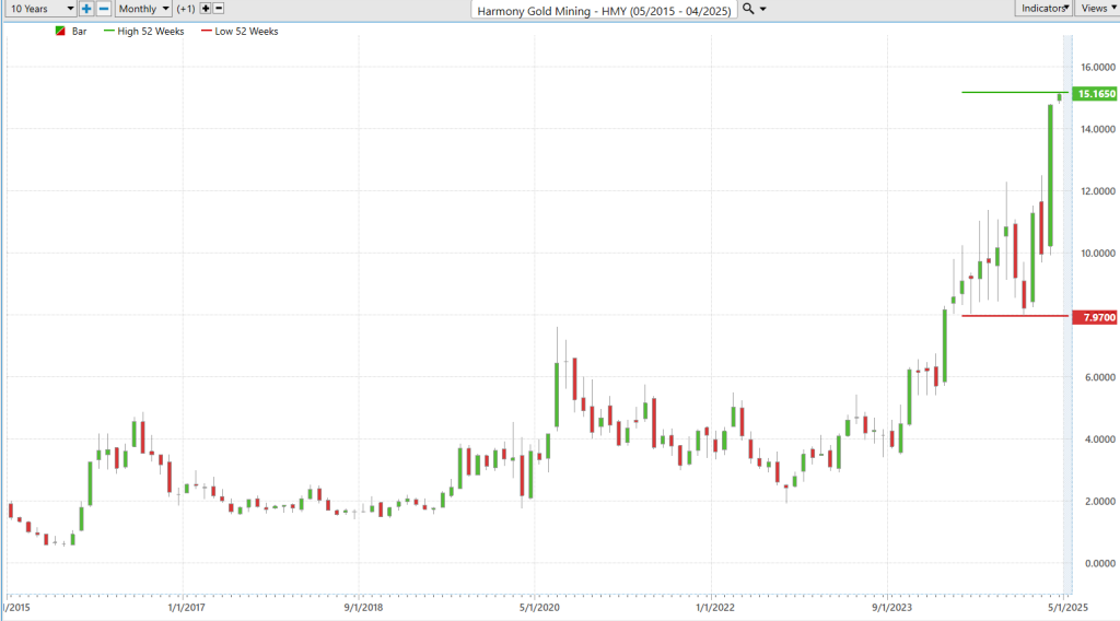 One of our favorite trading setups involves identifying assets that are simultaneously making 52-week and 10-year highs, a rare occurrence that signals a company is breaking through all historical resistance levels to reach unprecedented success. This setup indicates robust and sustained momentum, suggesting the company is outperforming past benchmarks and setting new standards in its performance. Reviewing the chart for Harmony Gold Mining Co. Ltd. ($HMY), it’s evident that for the past year, this stock has been in this unique position, continuously pushing into new high territory and signaling strong investor confidence.