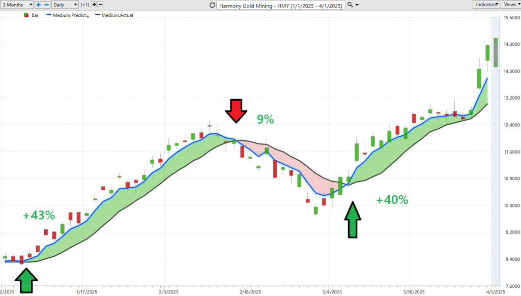 Enter the Predictive Blue Line. This isn’t just another line on your screen; this is the crux of your battle plan. Consider this line your seasoned commander, navigating you through the chaos of $HMY’s market movements. When this line is on the rise, it’s your signal to charge forward and seize buying opportunities. But when it takes a dive? That’s your cue to hold up, keep your powder dry, because danger lies ahead.