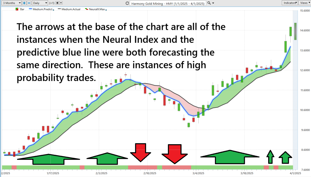 Here is the $HMY chart over the last 3 months with the VantagePoint A.I. Predictive Blue Line. There have been three trend forecasts in the past 3 months – all of them have been winners.
