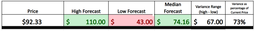 We’re talking about a 12-month high estimate of $110 and a lowball target of $43. That’s a $67 spread on a $92 stock. Do the math — that’s a 73% expected swing from top to bottom. That’s not just high, it’s off-the-charts dangerously high. It means the street has no consensus. Just chaos, big opinions, and a wide-open battlefield.