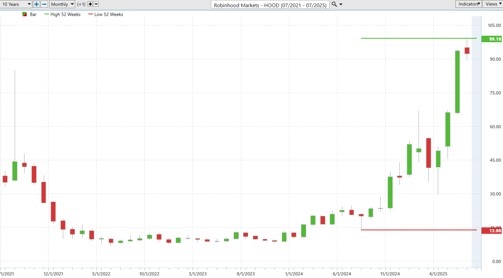 Here’s what most amateurs miss and pros obsess over — the 52-week range. It’s not just a couple of numbers tossed on a chart. It’s a window into the stock’s soul. And with Robinhood ($HOOD), that window is blown wide open.