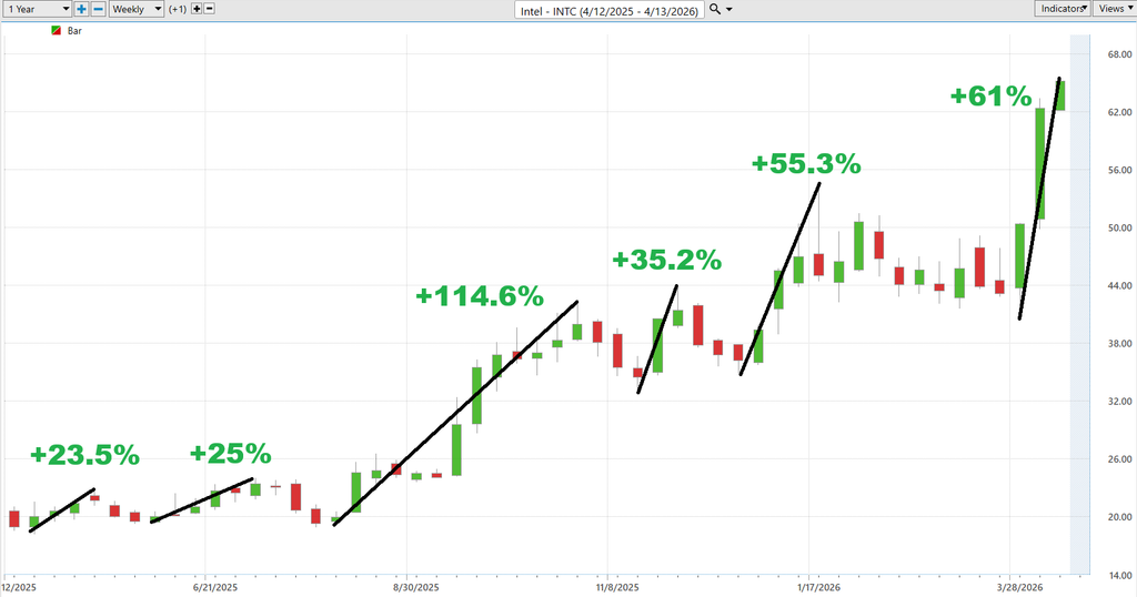 At the same time, if the trend continues and Intel stays in favor, the upside is not capped at single-digit gains. History shows that 30% to 50% upside waves are entirely possible, with occasional outlier moves far beyond that.