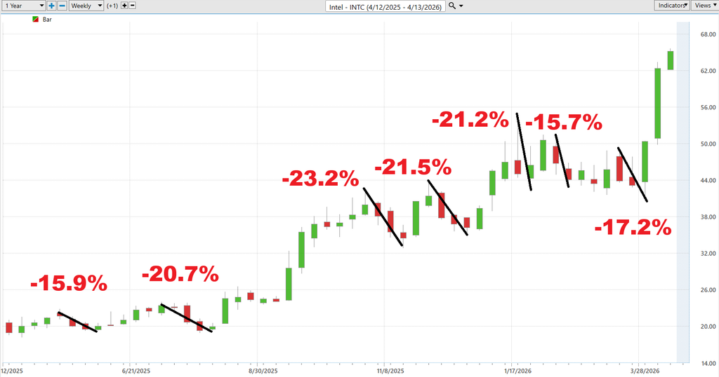 Over the past year, Intel has repeatedly delivered pullbacks in the range of -15% to -23%. These are not rare events. They show up consistently across the chart. The market has a habit of punishing this stock quickly when momentum stalls or expectations wobble. These declines are sharp, fast, and uncomfortable. If you are not prepared for a 20% drawdown, you are not prepared to hold this stock. This is not weakness. This is the cost of admission.