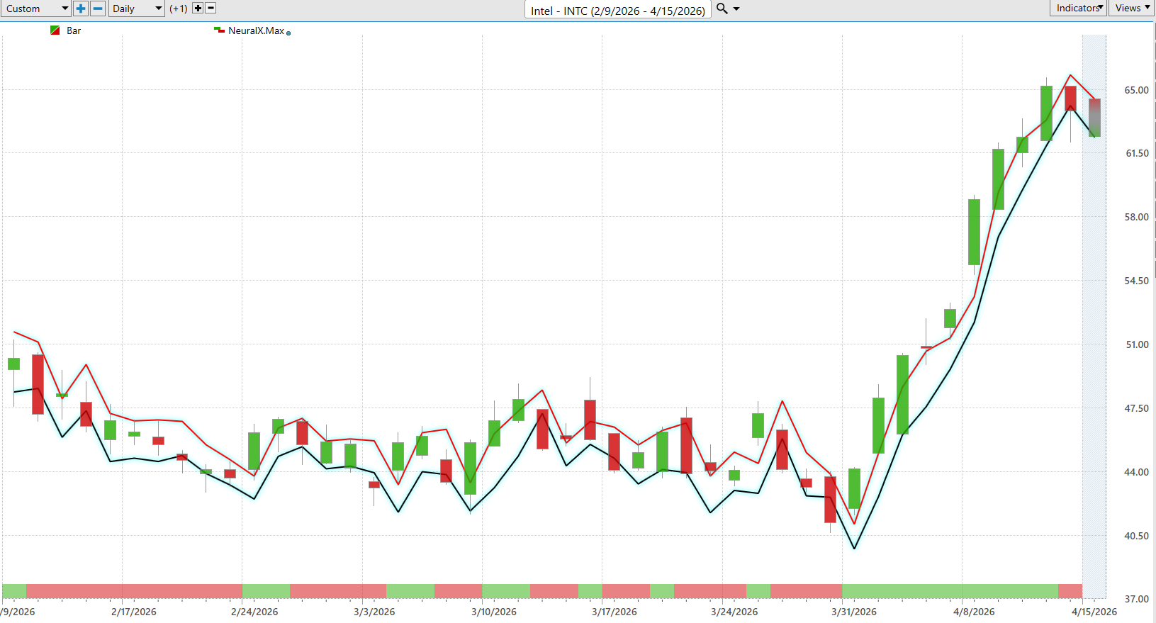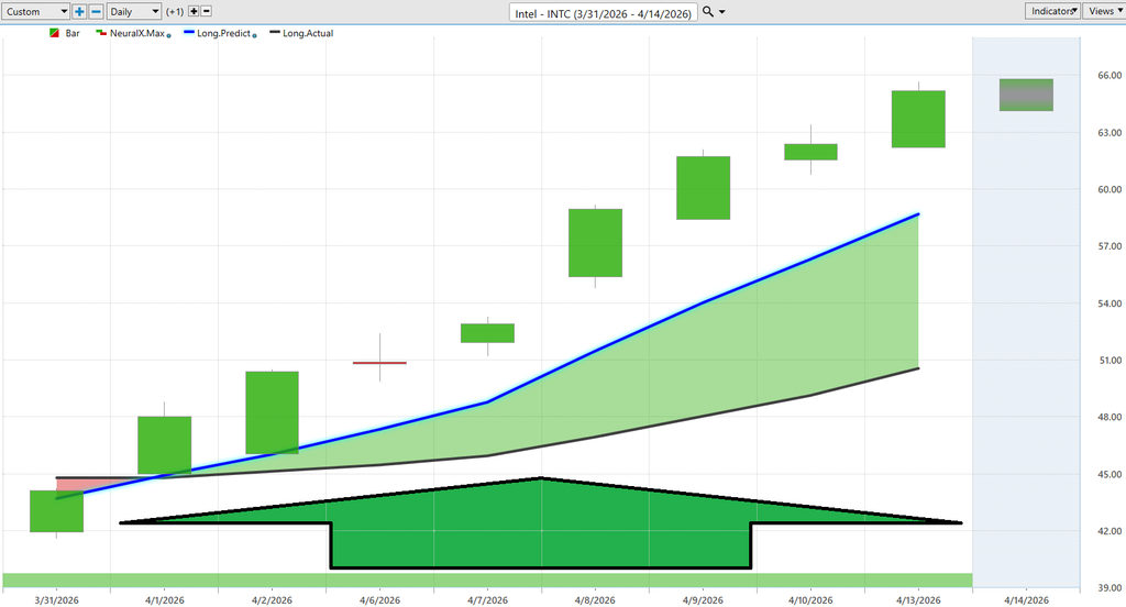 What stands out immediately is not just the strength in Intel’s price action, but the consistency of the signal underneath it. The Neural Index has remained firmly positive throughout this stretch, aligning with the steady advance in price. This matters because the Neural Index is not reacting to what has already happened. It is attempting to forecast the next 48 to 72 hours. When that signal stays positive during an uptrend, it suggests that short-term strength is not being exhausted. It is being reinforced.