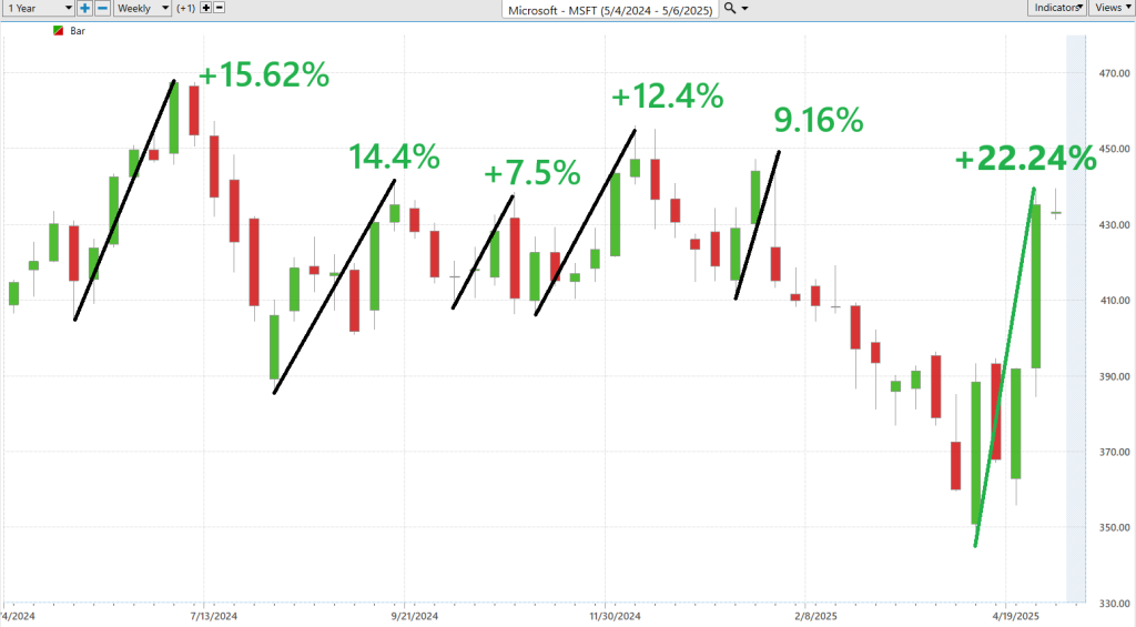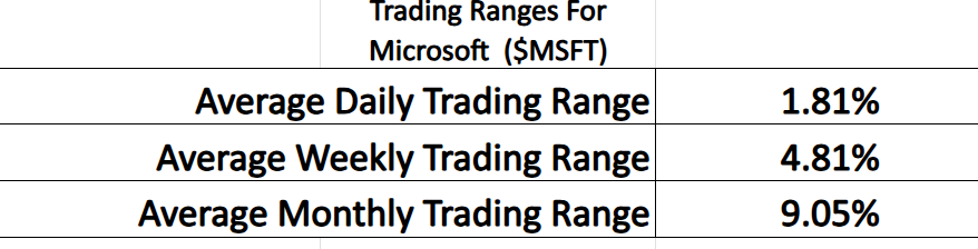 Take $MSFT. Pull back the curtain and look at its trading behavior over daily, weekly, and monthly time frames for the last year.