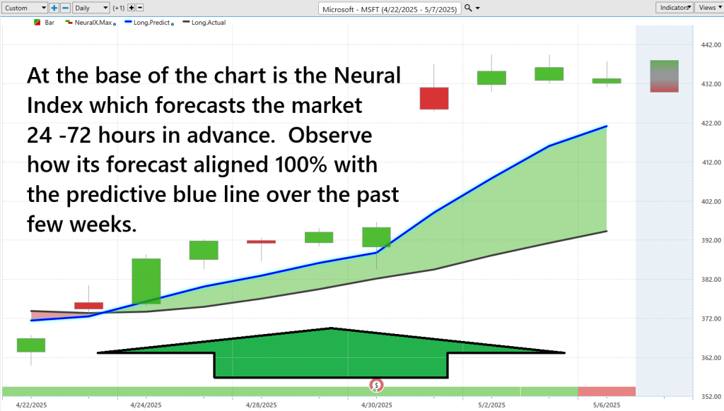 If you’re thinking about trading $MSFT, understand this: success doesn’t come from guesswork or gut instinct. That’s where VantagePoint’s Predictive Blue Line enters the picture. Don’t confuse this with a typical trendline or technical squiggle. This is artificial intelligence at its most elegant — a strategic, forward-looking signal designed to cut through the market’s noise and reveal when momentum is truly shifting. When that line trends upward, it’s your green light. And when it starts to curl downward? That’s your early warning system — a cue to tighten your stops or reevaluate your exposure.