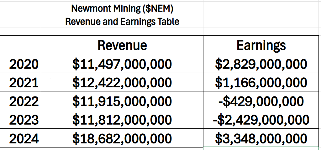 Now look at the revenue and earnings table and you can quickly see the financial journey $NEM has had over the last 5 years, and it certainly has not been easy.