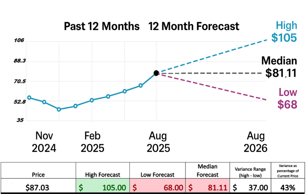 Here’s the deal: fifteen of those hotshots have put their reputations on the line. The high forecast sits at $105, the low down at $68, with the middle ground hanging around $81.11. That spread — thirty-seven bucks of daylight between the dreamers and the doomsayers — is your volatility clue. It’s the size of the boxing ring you’re stepping into.