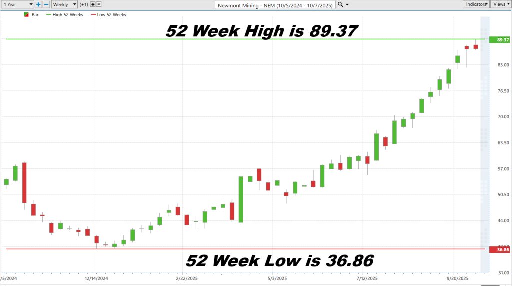You’re looking at a textbook breakout story — and the kind of chart that gets traders fired up. Over the last 52 weeks, Newmont Mining has gone from the basement to the penthouse, blasting off from a low of $36.86 to a new high at $89.37. That’s a 60% volatility range — plenty of energy for active traders who thrive on movement.