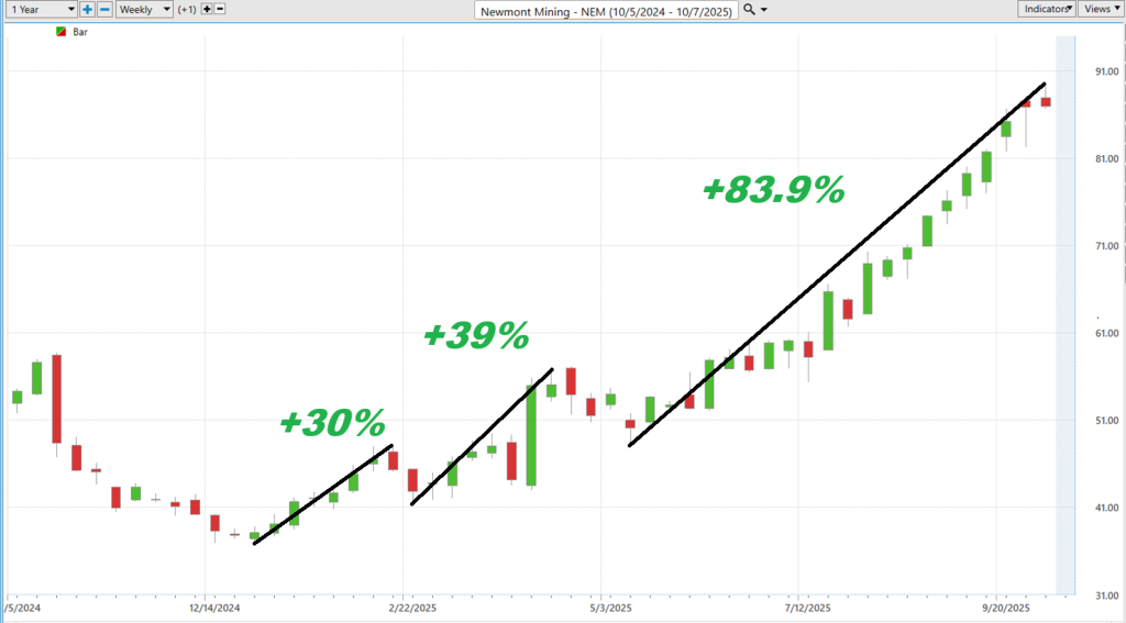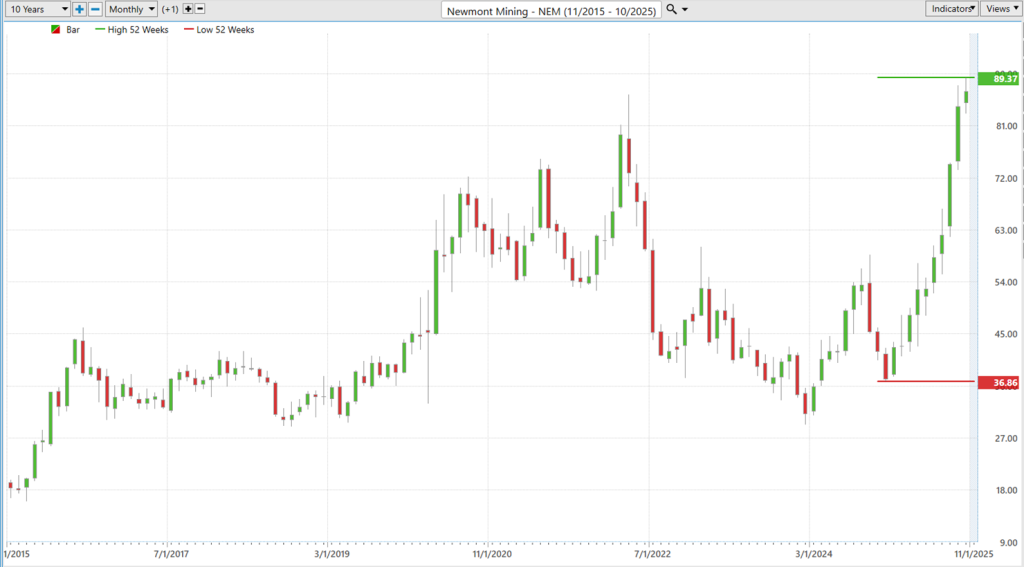 What you’re seeing on this 10-year chart of Newmont Mining is a declaration. When a stock simultaneously breaks through both its 52-week and 10-year highs it’s rewriting its own narrative. These moments are rare, and when they happen, they speak volumes about conviction — from the boardroom to Wall Street trading desks.