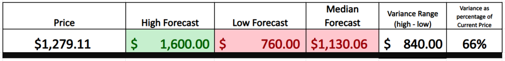 We advise traders to pay close attention to the variance between the most bullish and most bearish forecasts. This provides us with an outline of the expected volatility moving forward. This range at present is $840 or 66% of the current price. This level of volatility is exceptionally high.