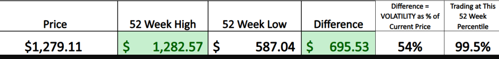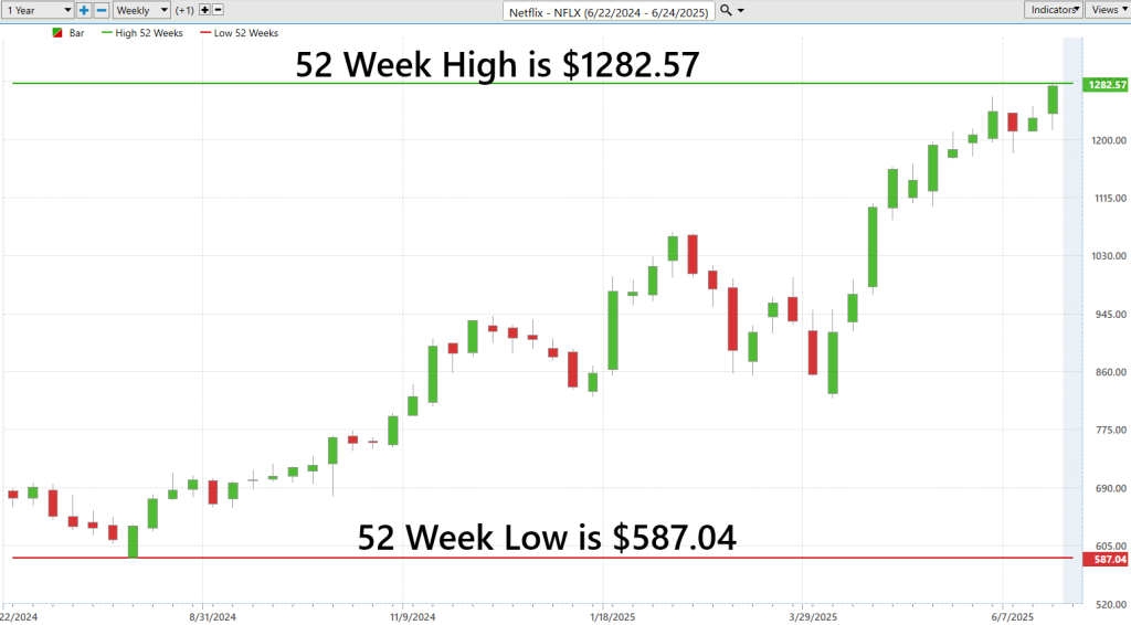 As of today’s trading, the 52-week high for Netflix ($NFLX) was made on June 5, 2025, when the stock peaked at $1,282.57. Conversely, the 52-week low occurred at $587.04, on August 5, 2024, marking the floor for the past year’s range.