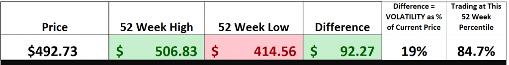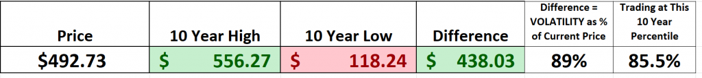By zooming out to the 10-year chart we can see two crucial areas of price resistance on the chart, the 52-week high at $506.83 and the 10-year high at $556.27. While the trend is clearly up these areas of resistance can challenge us to re-evaluate how we approach this market. Some alternatives that are potentially very attractive are option spreads.
