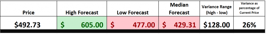 We advise traders to ALWAYS pay close att3ention to the variance between the most bullish and bearish forecasts as this is where the volatility is baked into the price action. At present time, Wall Street analysts have a variance of opinion of $128. This represents 26% of the current price and is considered moderately high volatility.