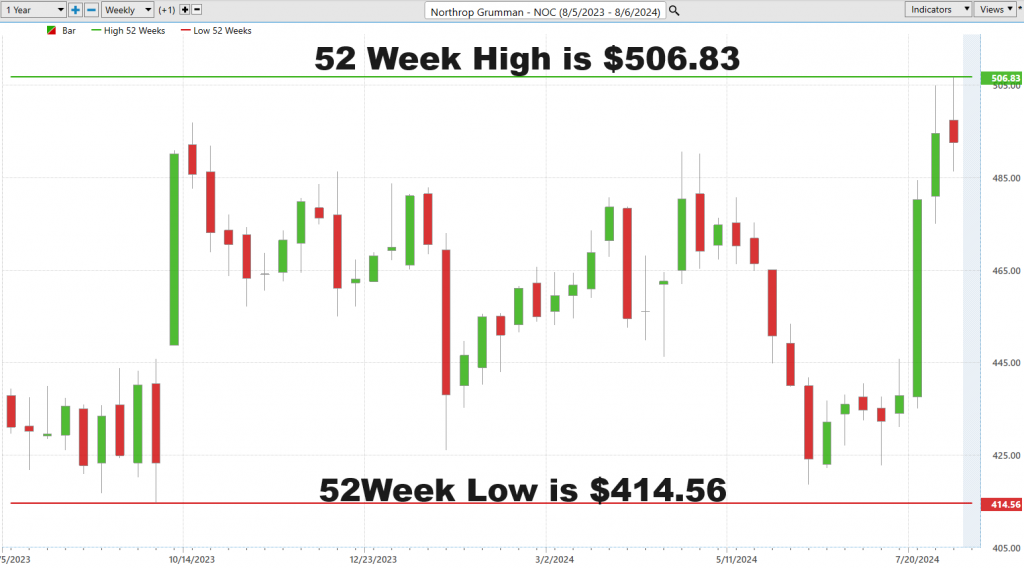 The 52-week high for Northrop Grumman is $506.83, while the 52-week low is $414.56, with a recent close at $492.73. This range illustrates significant volatility and momentum shifts. For traders, this is essential to understand future potential price movements. Using the annual trading range as a guide, traders can anticipate that $NOC could conceivably trade 19% higher or lower over the next 52 weeks, given these historical price swings. This knowledge is crucial for planning entry and exit strategies, managing risk, and setting realistic profit targets.