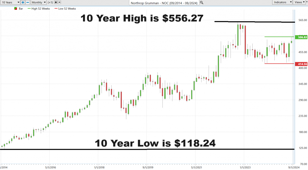 But don’t stop there. Zooming out to study the 10-year chart provides a broader perspective on the longer-term trend. Over the last decade, $NOC has traded as high as $556.27 and as low as $118.24.