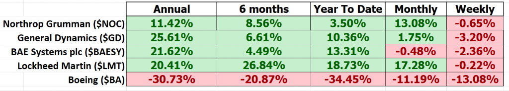 Finally, we compare $NOC to the other defense contractors to gauge performance in the sector: